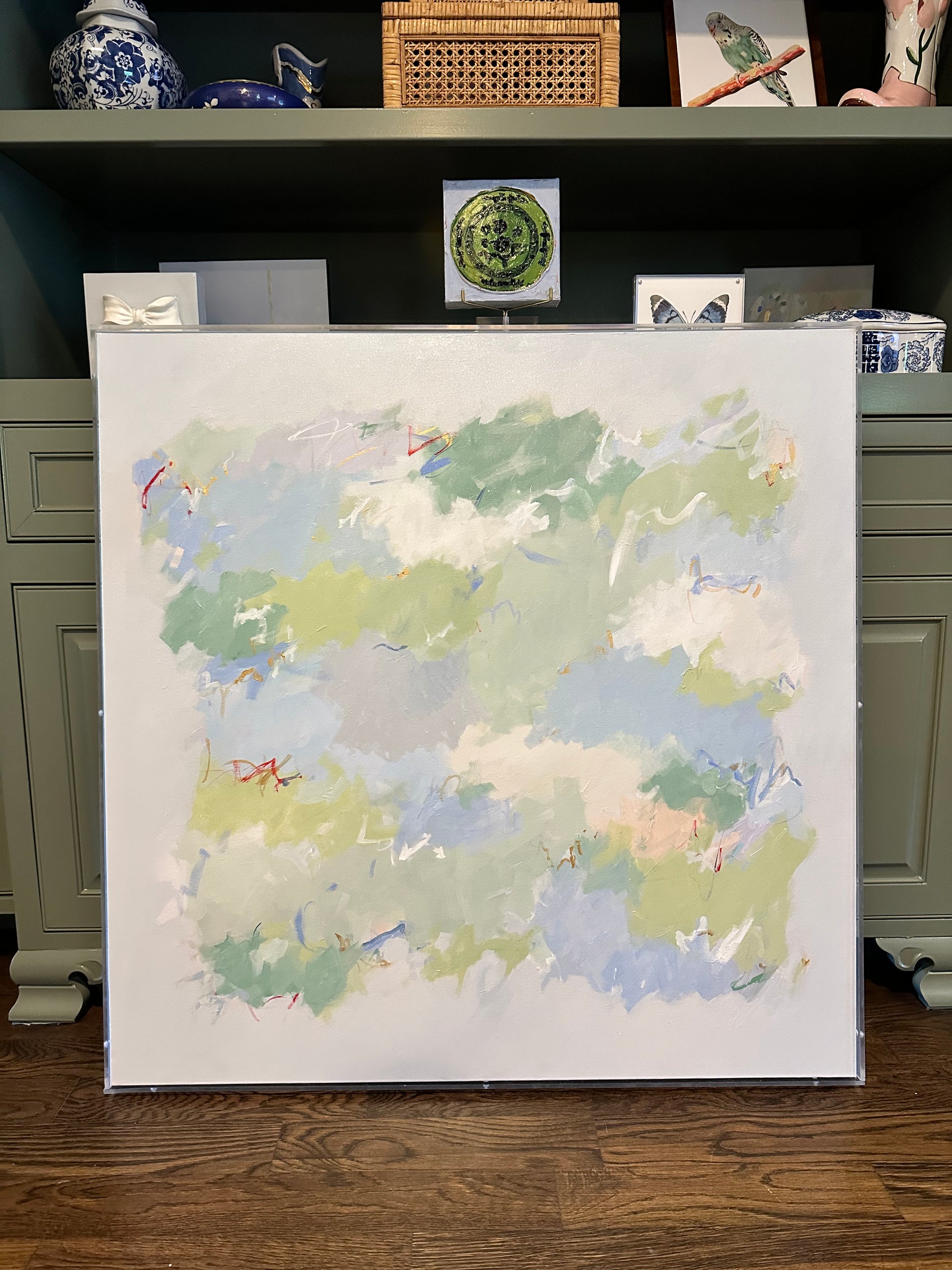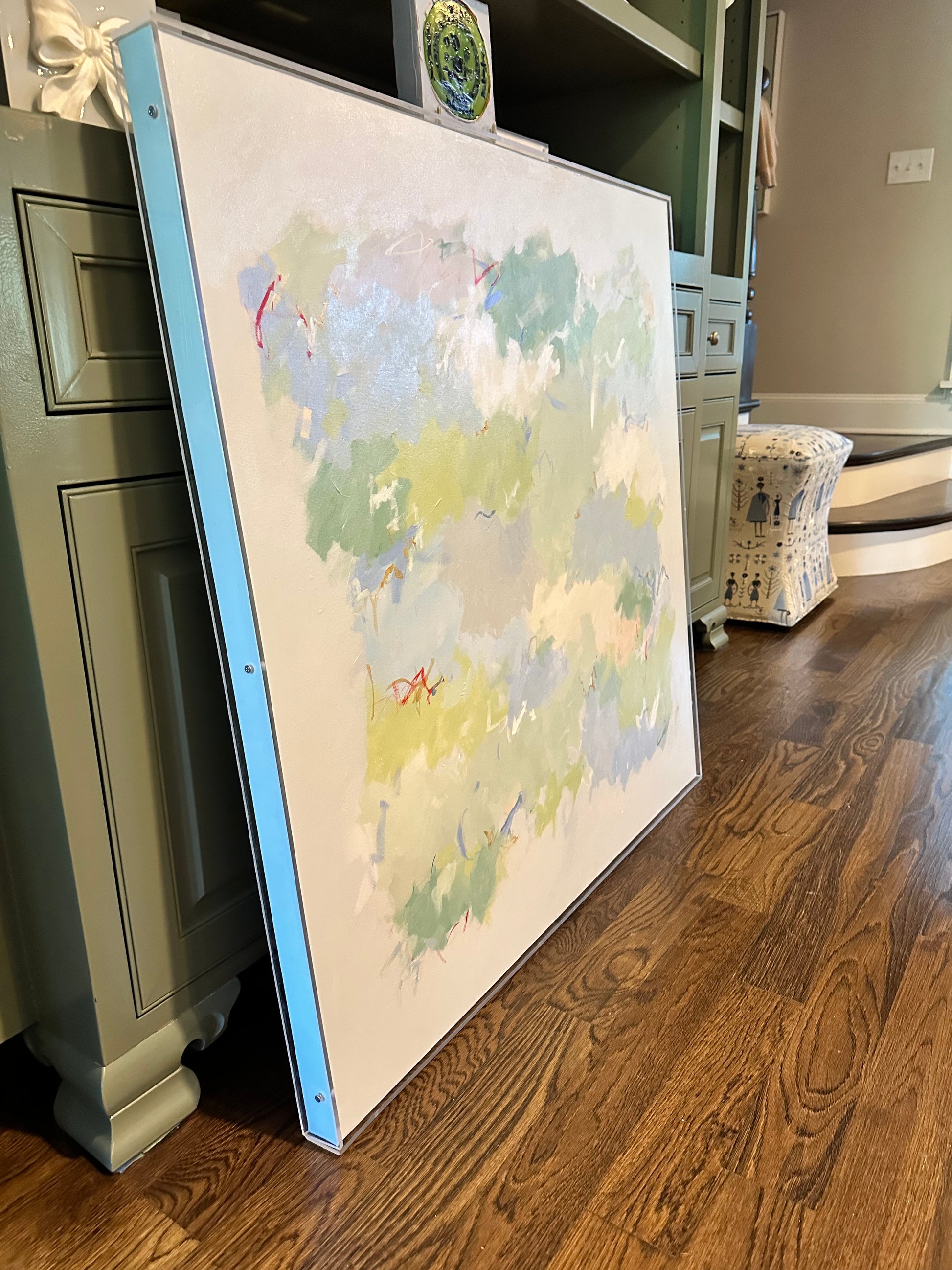 Inspired by the colors and spirit of an east coast summer, this acrylic 36x36 gallery wrap canvas is full of peaceful colors, layers and markings.